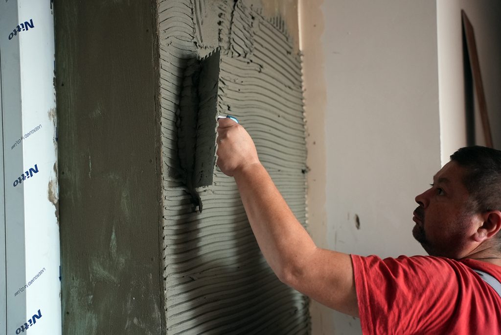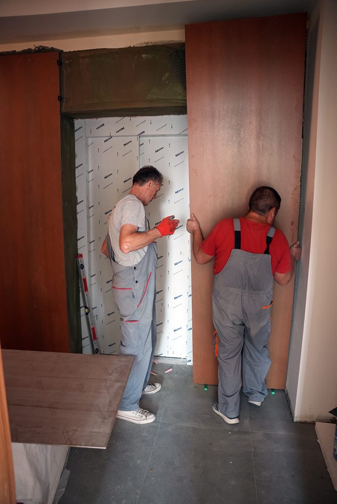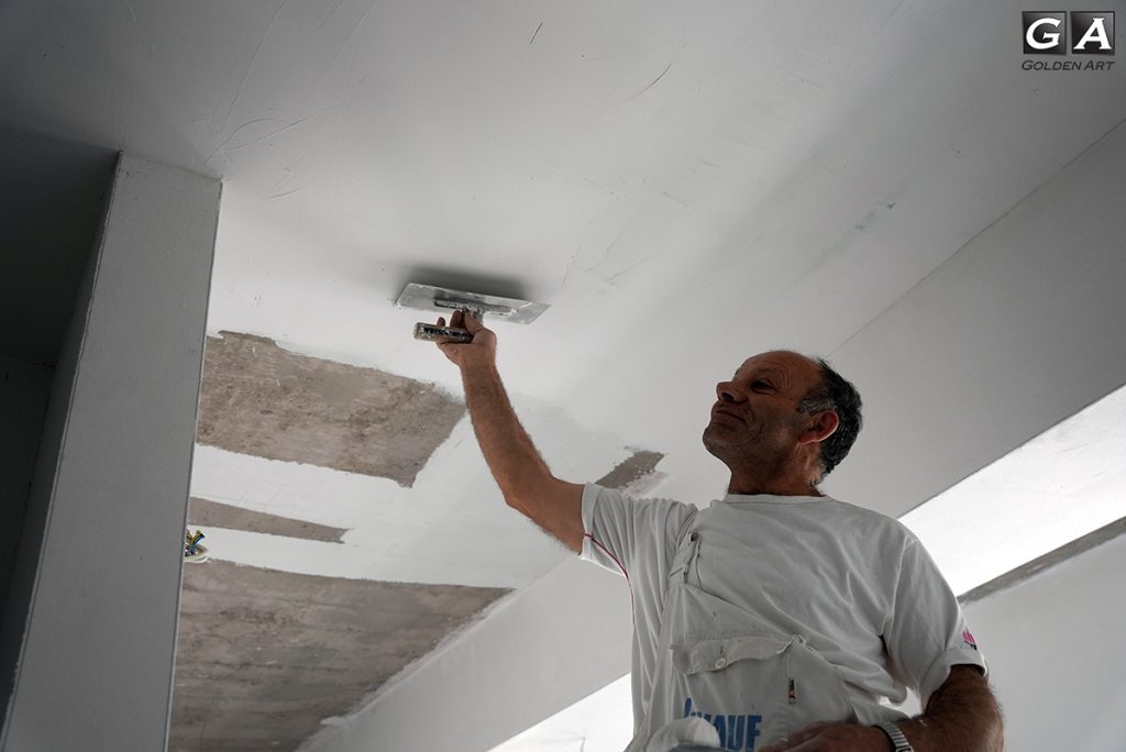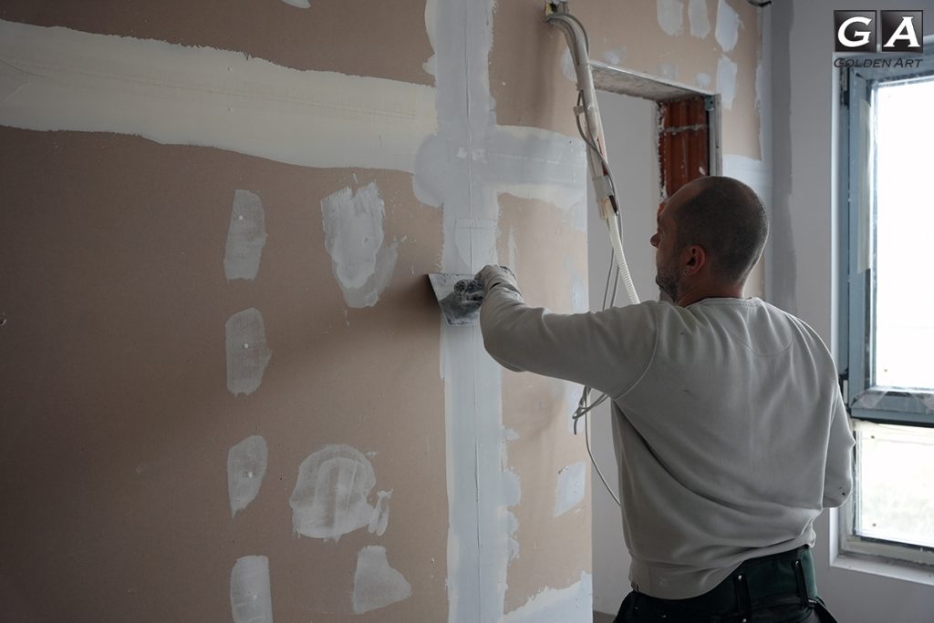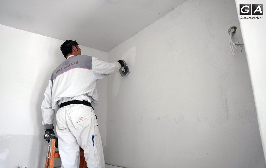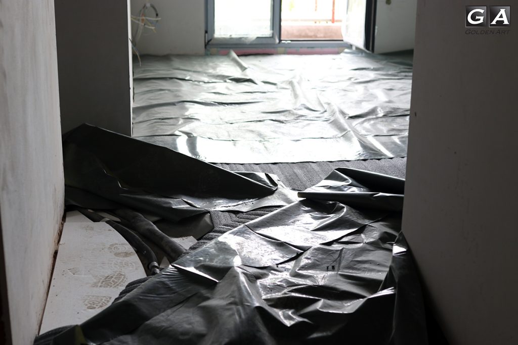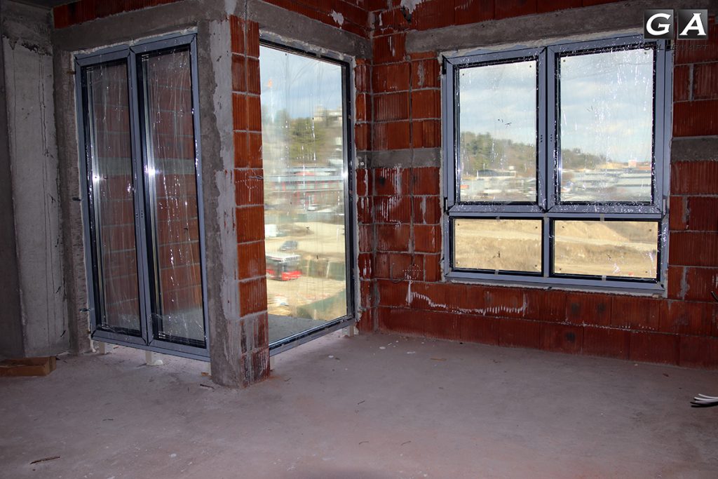 Нанесување на гипсан малтер МП75 на 1 кат. Комплетирано нанесување цементен малтер во кујни и купатила. Комплетирано поставување на прозори.