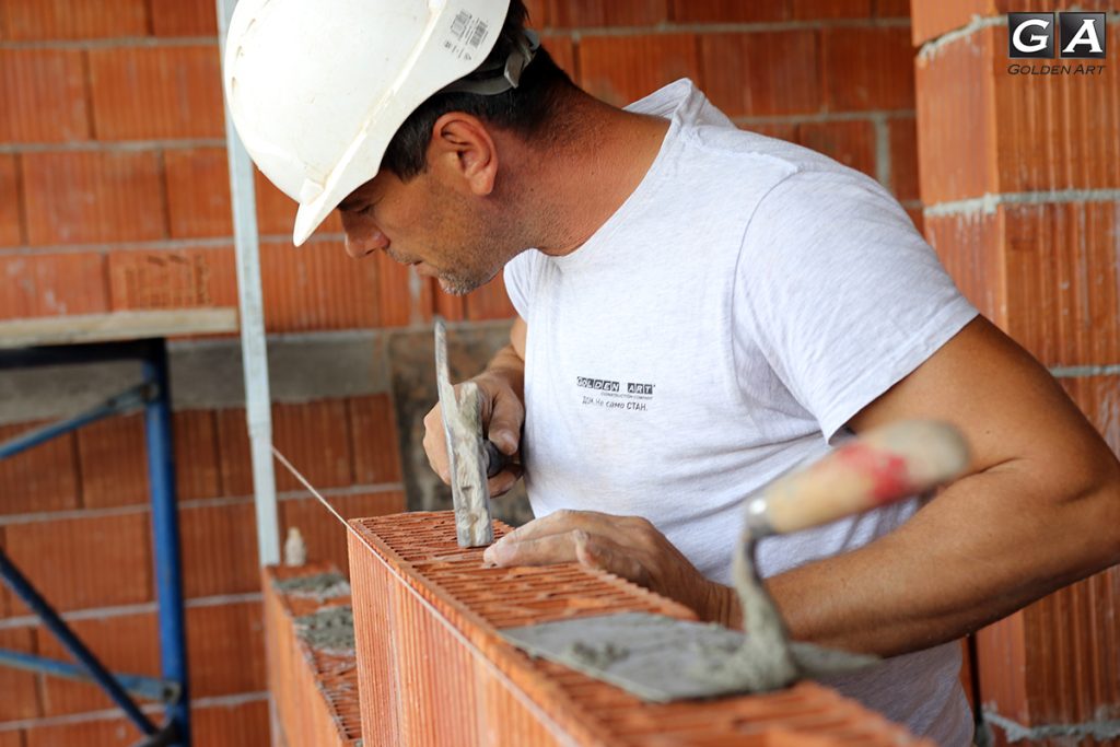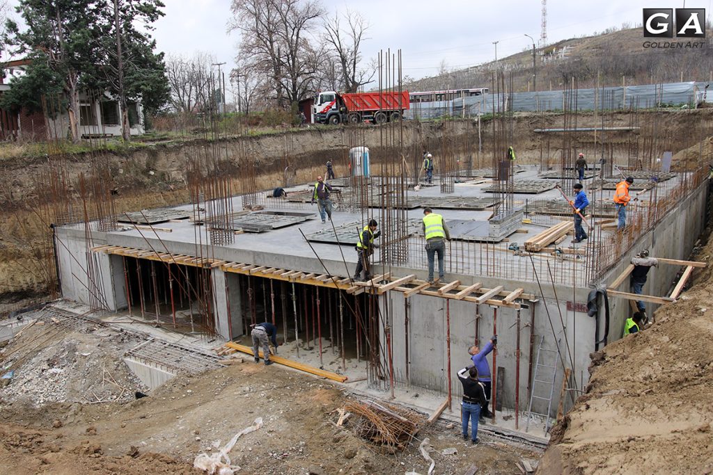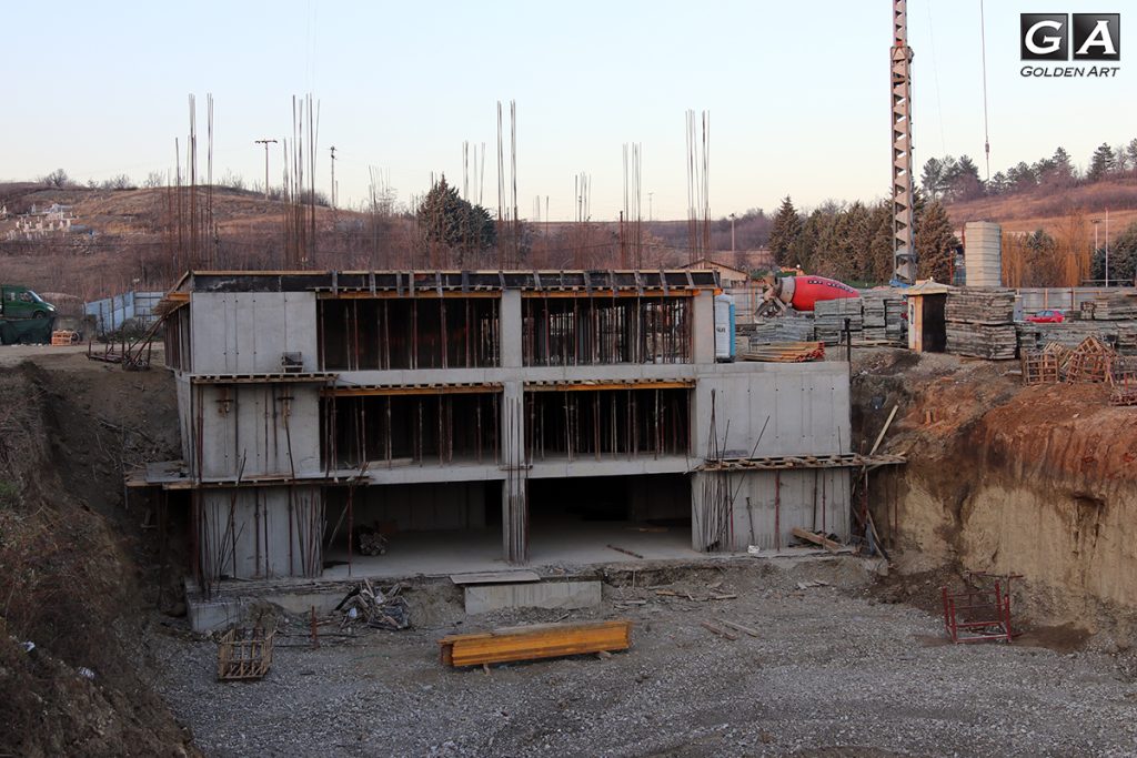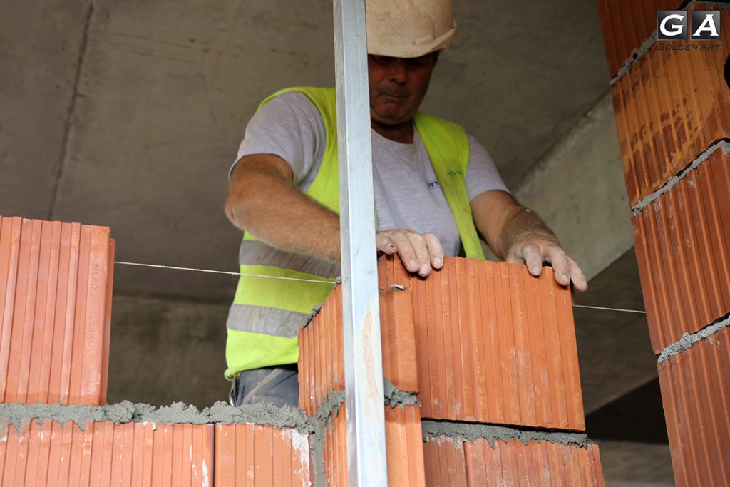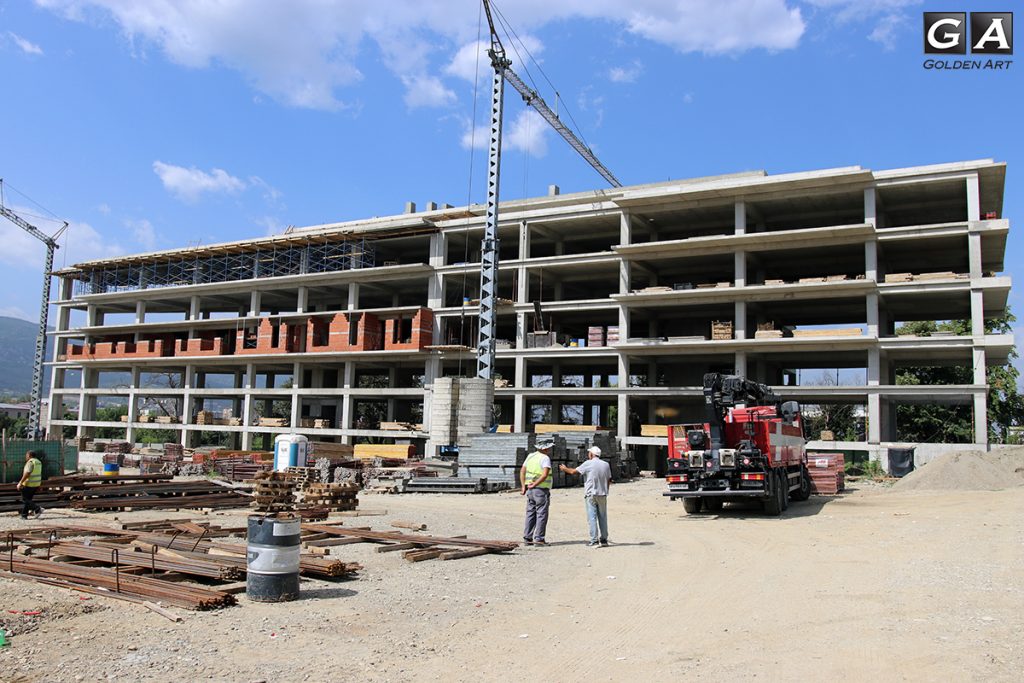 На објектот се работи активно на повеќе позиции. Со поставување на плочки сме во завршна фаза на последниот кат, ја комплетиравме цементната кошулица, додека на 1 и 2 кат се работи на глетовање на ѕидови и плафони.